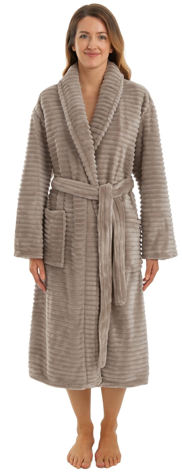 Stay warm and comfortable with this ladies double layered fleece dressing gown, crafted for cosy moments at home. The outer layer is made from a soft, premium ribbed fleece that feels smooth and plush, while the inside is fully lined with thick sherpa for exceptional warmth.
