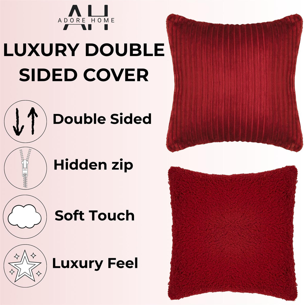 Make a bold, warm statement with our Ribbed Cushion Cover with Sherpa Reverse in Wine. The rich colour and ribbed texture bring depth and luxury to any room, while the sherpa reverse adds plush comfort. Perfect for creating a warm, inviting atmosphere. Available in 1, 2, 4 or 6 packs.
